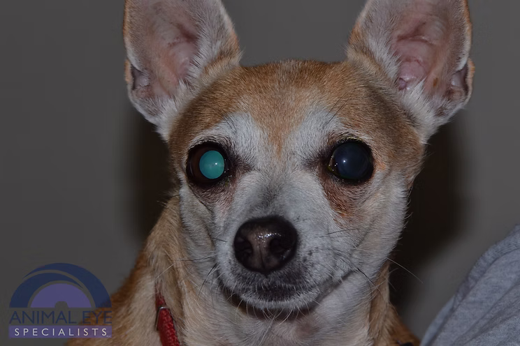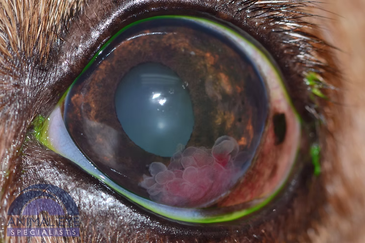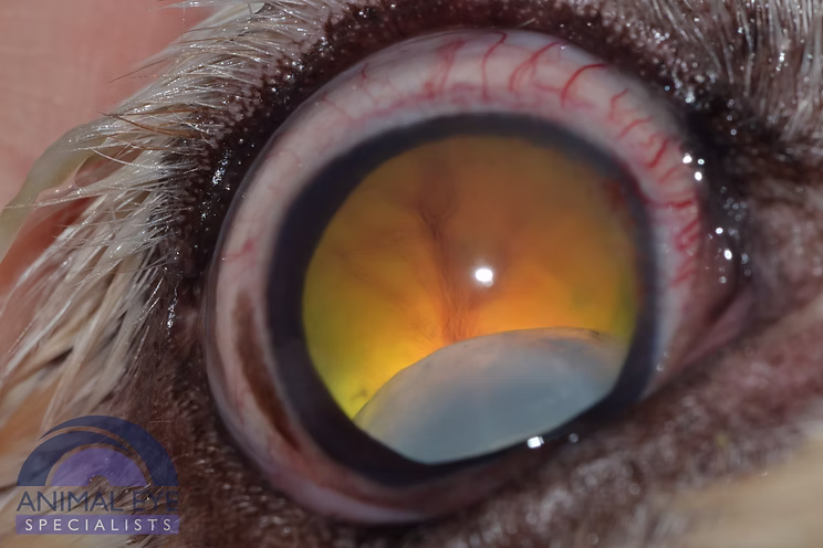 This patient had an ulcer that got infected and caused it to progress to the deepest layer of the cornea. A descemetocele is an ulcer that is down to the last layer of the cornea and the eye is at great risk for rupturing if not treated. It is typically easy to visualized as a divot or "dent" in the surface of the eye.
