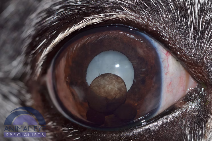 This cat had a sequestrum on his cornea. A sequstrum is a dark brown discoloration to black plaque that covers part of the cornea. As the sequestrum progresses to deeper corneal layers, the eye becomes more at risk for rupture if it sloughs out. This cat had a keratectomy to remove the affected layers of cornea before it got any deeper. This condition most commonly affects Persians and Himalayans.